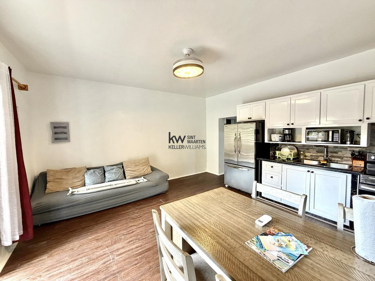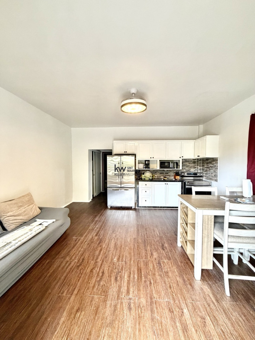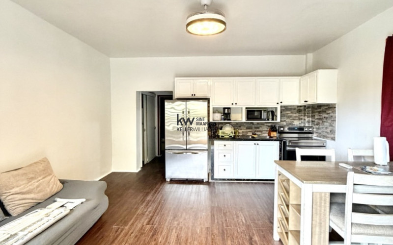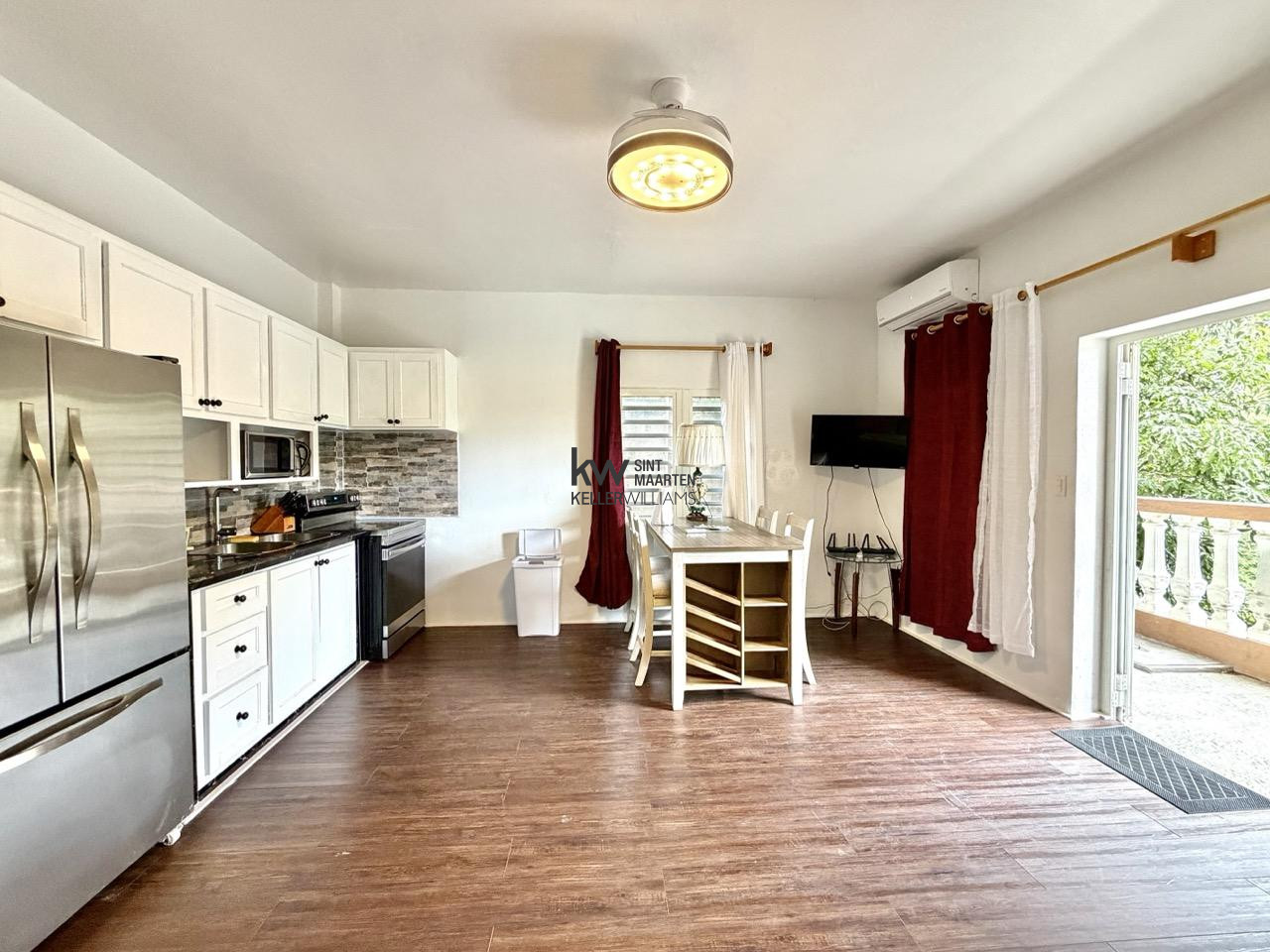 The open plan living and kitchen area runs the full width of the unit wood-look tile floors, white cabinetry, stainless steel appliances, and a dining table that seats four comfortably. A white aluminum door opens onto a balcony with open valley views, and clear louvered windows on two sides keep natural light moving through the space from morning to evening.