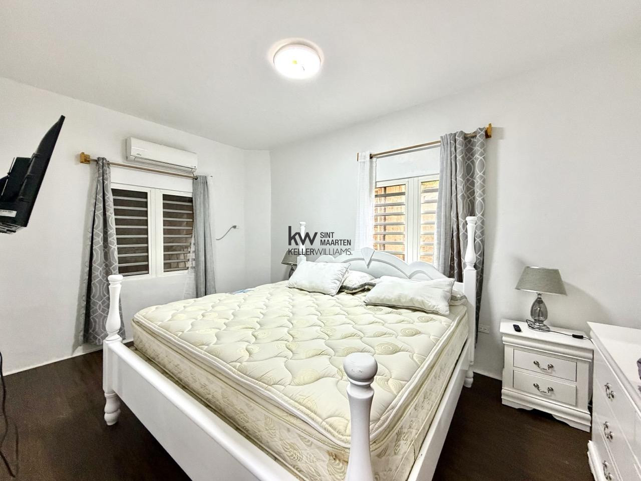 The bedroom fits a king bed with room to spare, has its own A/C unit, wall-mounted TV, and two louvered windows that let breeze through.