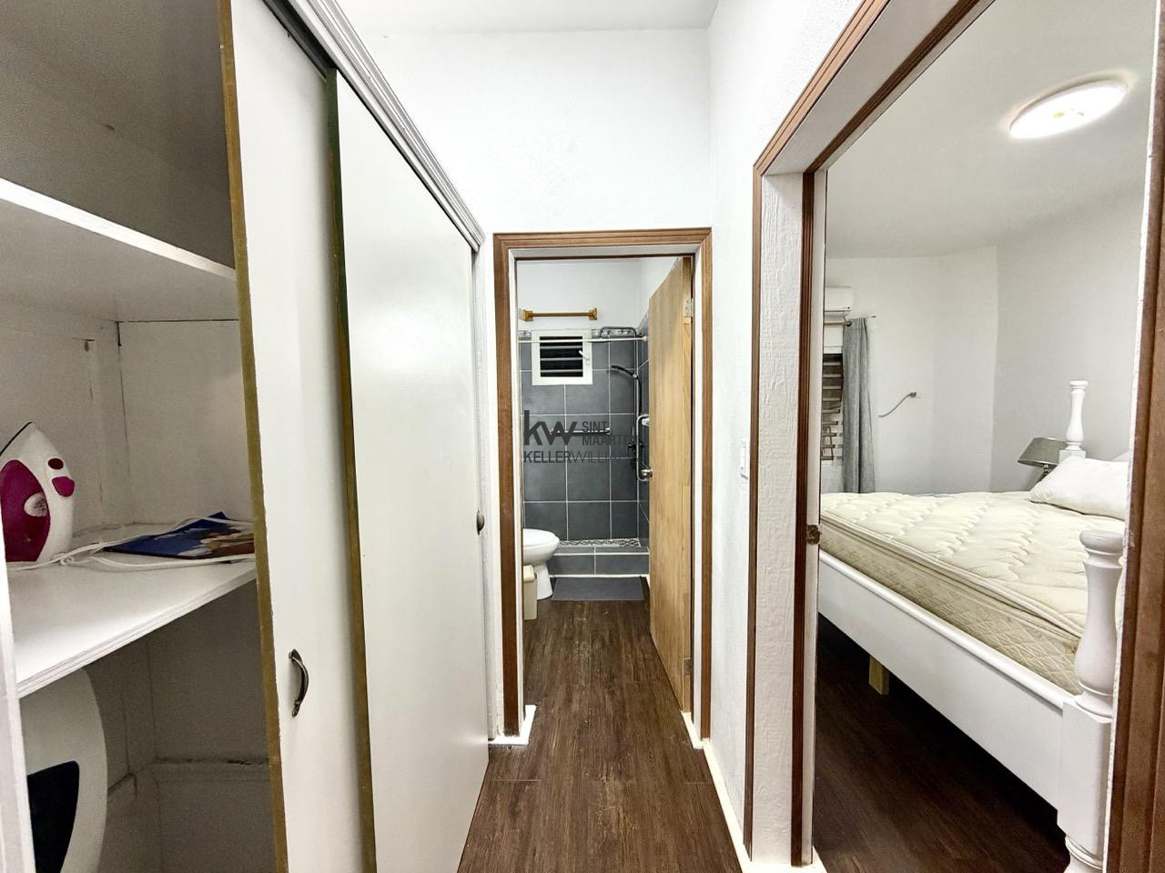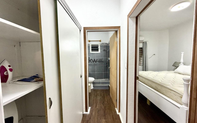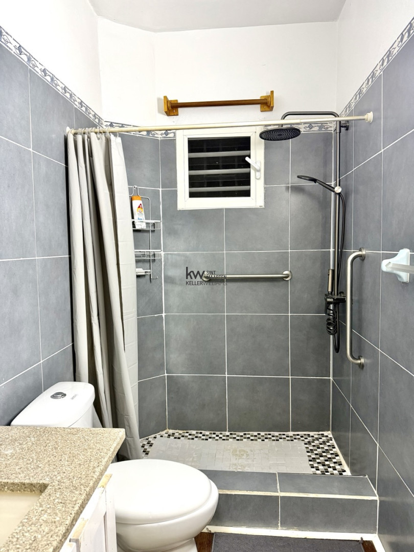 The bathroom is tiled in slate grey with a rainfall shower head and a water heater. Everything you need to live and work comfortably is already here. Furniture, Appliances, Starlink internet, and a location that puts you close to everything on the island without the noise of the busier areas.