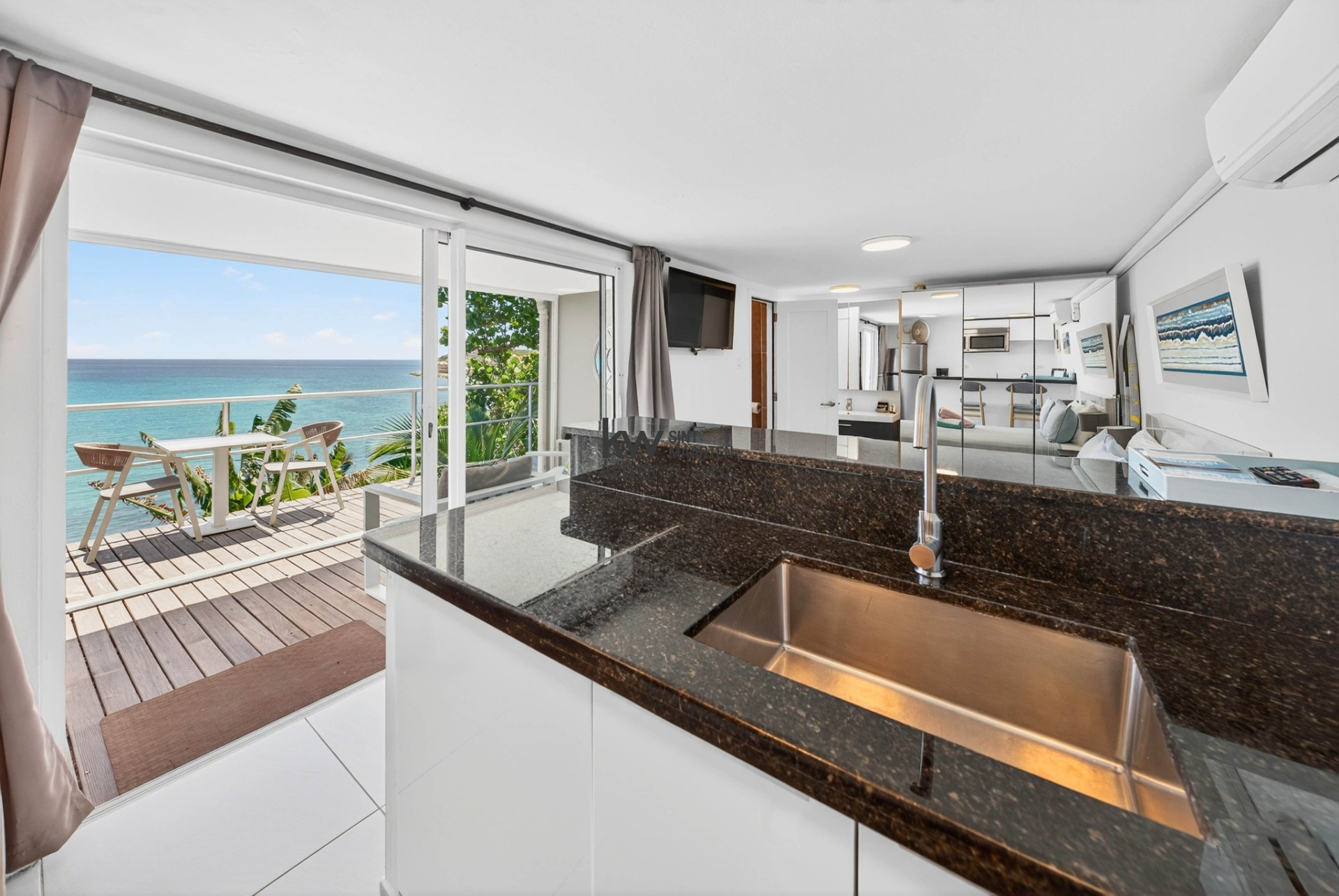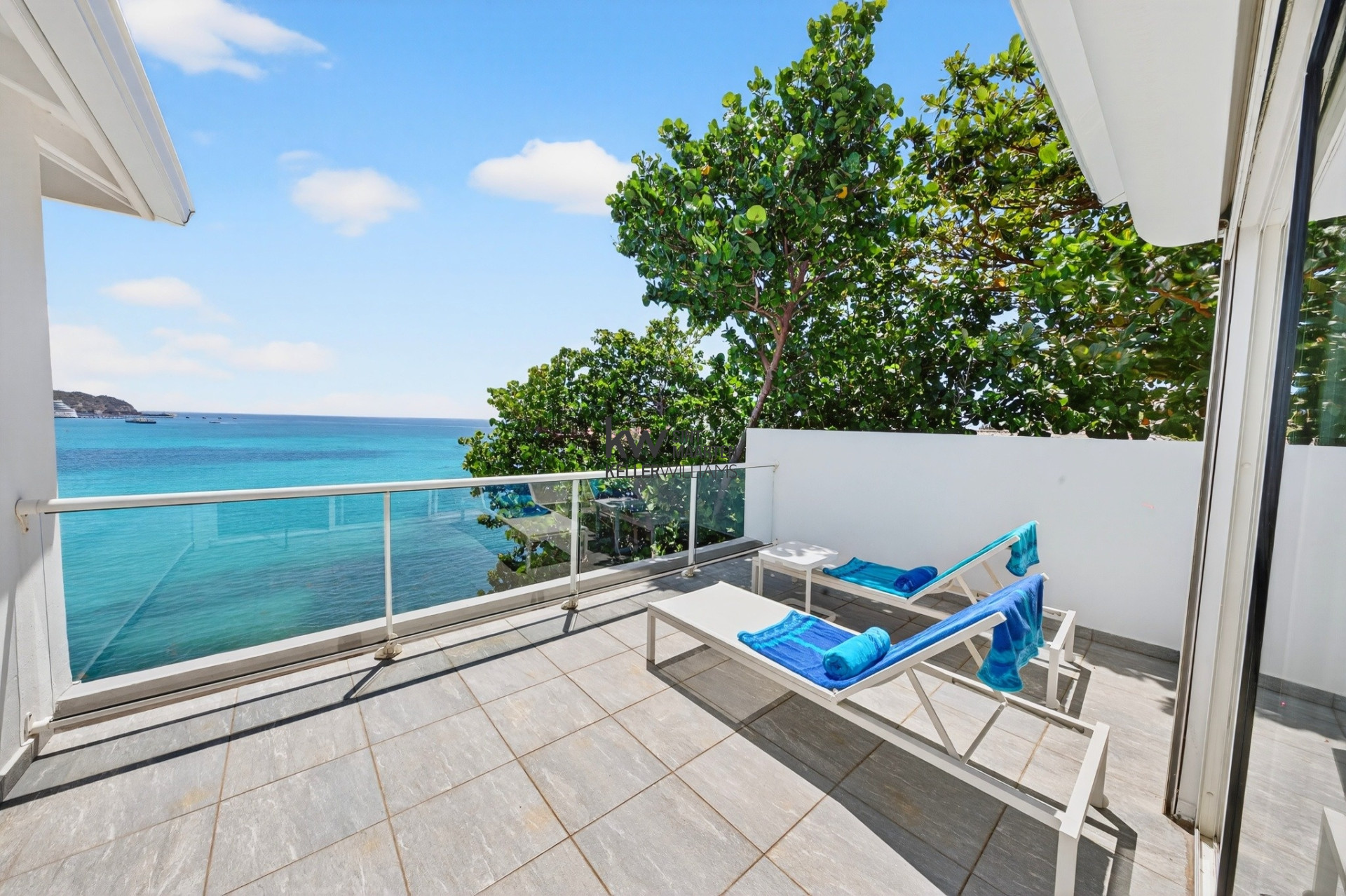 Sliding glass doors to a private terrace overlooking the sea