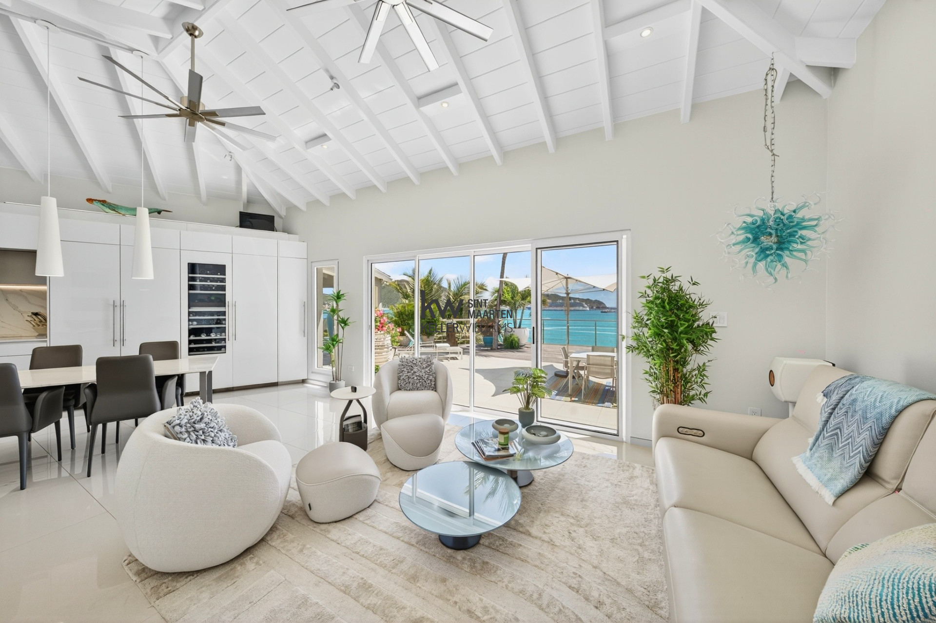 Spacious living and dining areas that open directly to the oceanfront terrace