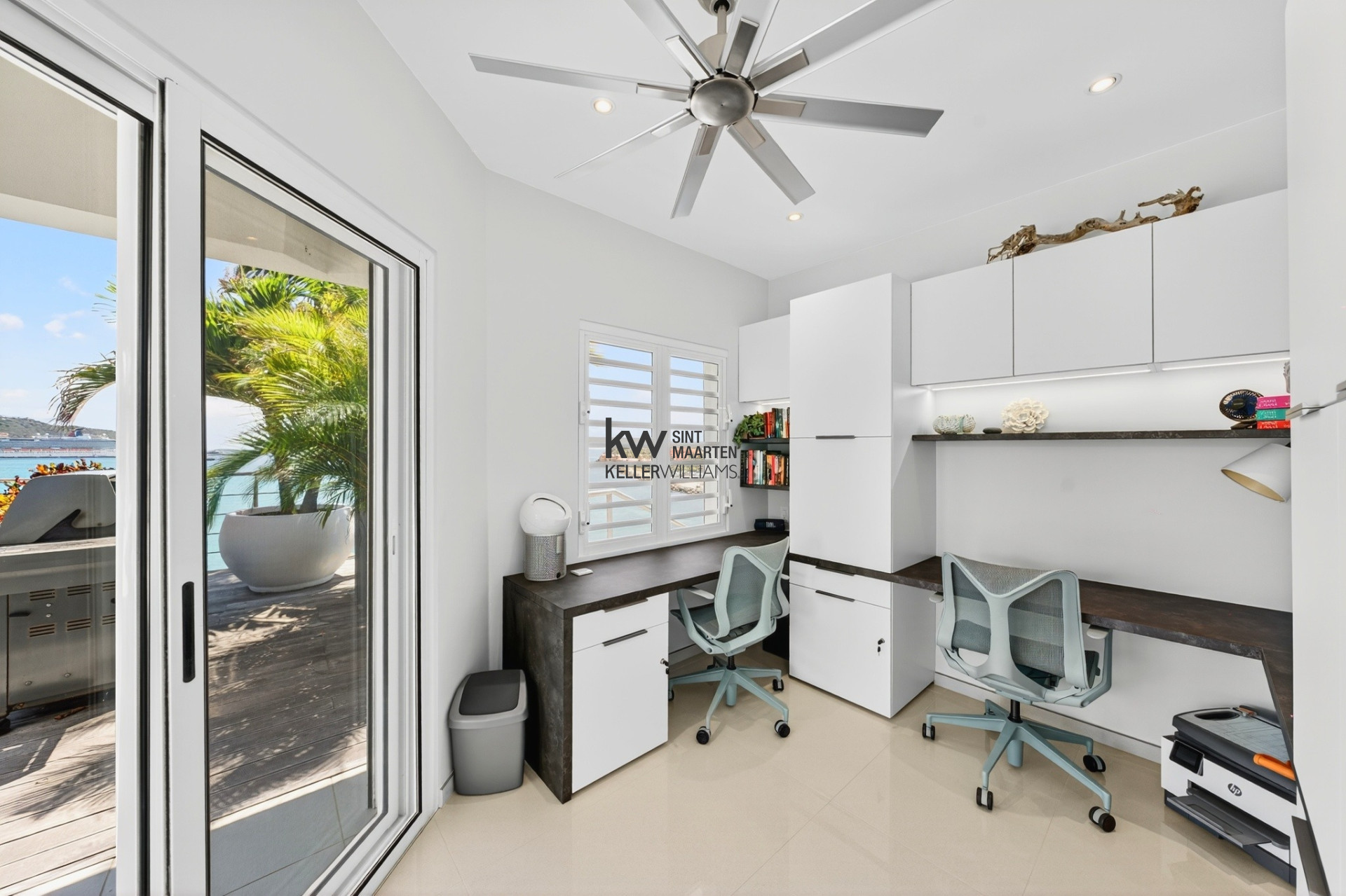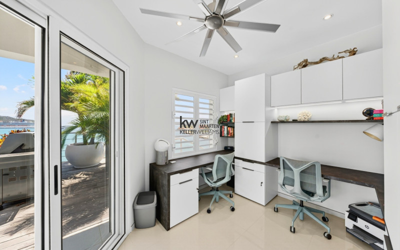 Dedicated office with built-in dual workstations and terrace access