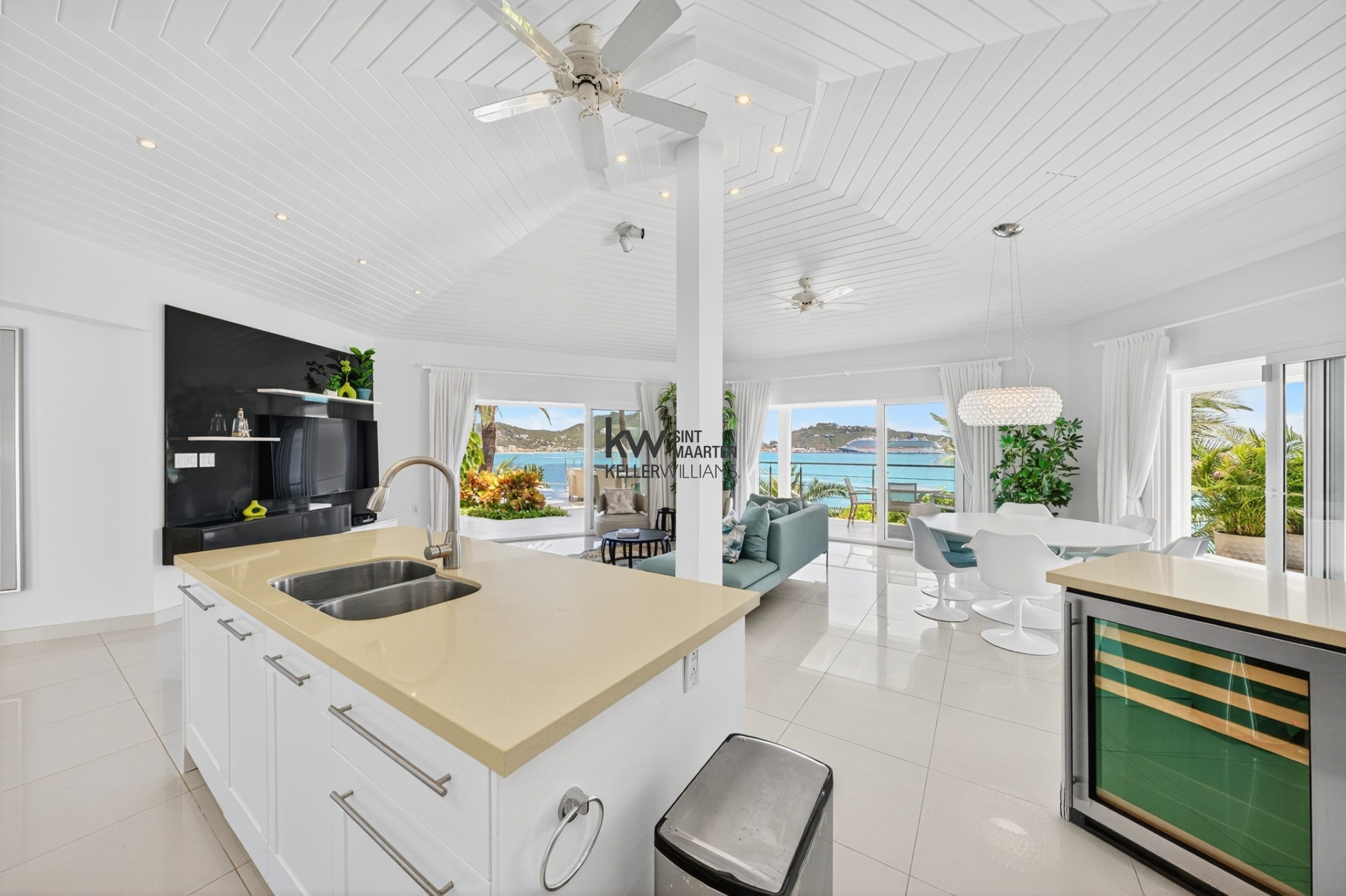 A stunning open-concept great room with panoramic views over the entire bay